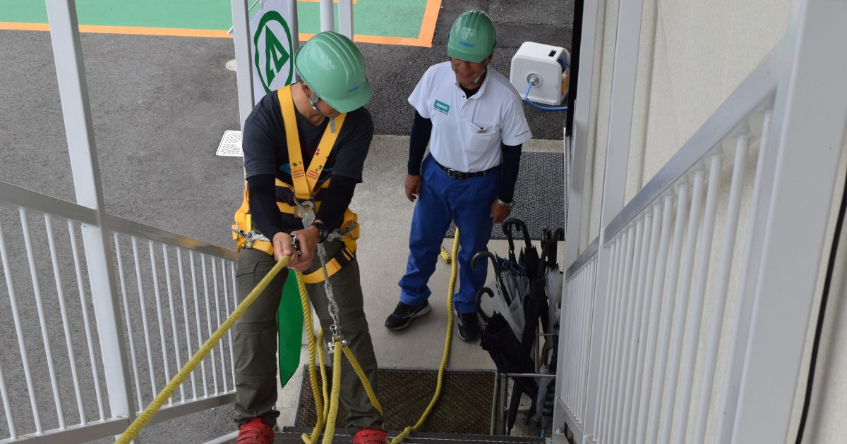 ロープ高所作業特別教育については、同センターの講師から、ロープ高所作業に関する知識、メインロープに関する知識、労働災害の防止に関する知識などの座学の後、ロープの扱い方やフルハーネス型墜落制止用器具を装着して階段を降下する実技が実施されました。
