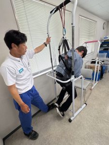 フルハーネス型墜落制止用器具使用作業特別教育については、コベルコ教習所熊本教習センターの講師から、作業に関する知識、墜落制止器具に関する知識などの座学の後、実技としてフルハーネス型墜落制止用器具の装着や落下して吊るされた場合を想定した体験が行われました。