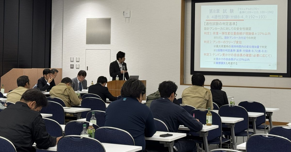 令和7年11月4日、「グラウンドアンカー技術講習会」を、株式会社エスイーから和田弘氏他3名の方を講師に招いて、グランメッセ熊本で開催しました。