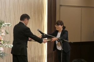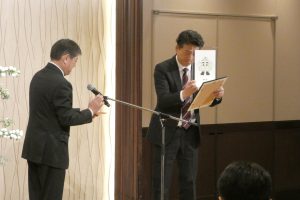 冒頭、事務局の井上職員が、全国建設産業連合会会長表彰を受けたことを披露し、また、会員からの公募作品の中から選定したマスコットキャラクターを発表し、採用作品の応募者に対して最優秀賞の表彰を行いました。